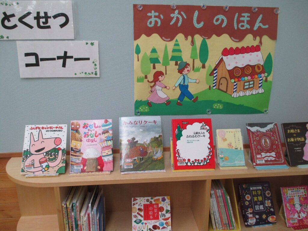 みらい平分館の児童向け特設コーナーで「おかしのほん」を展示しています。