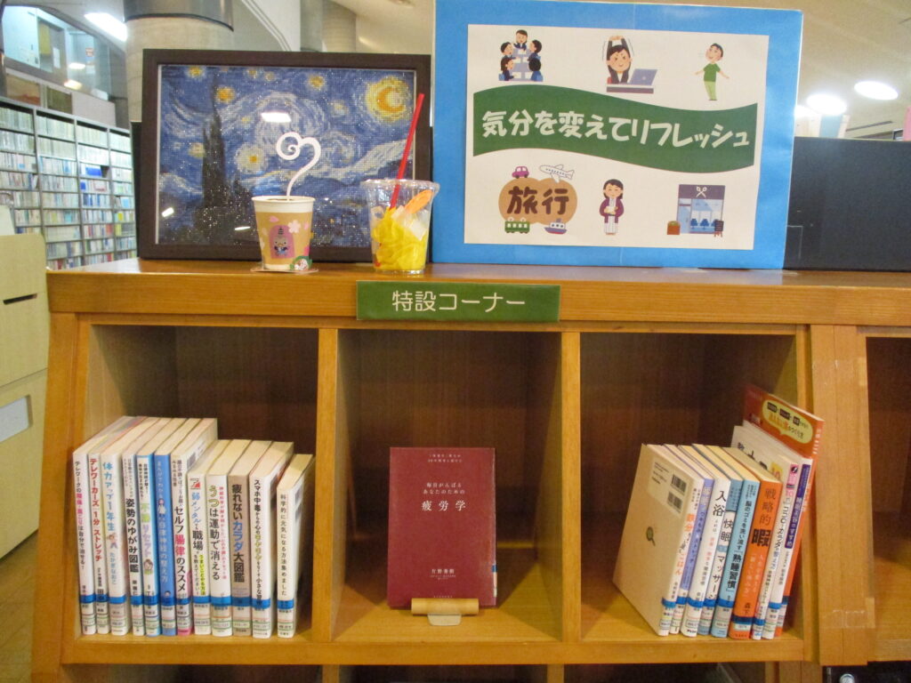 本館・大人向け特設コーナーでは『気分を変えてリフレッシュ』をテーマに、本を展示しています。