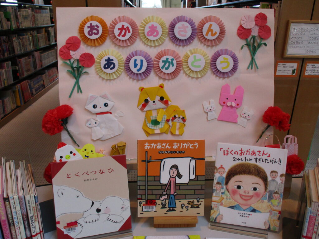 本館・児童向け特設コーナーで、「おかあさん ありがとう」の展示をしています。
