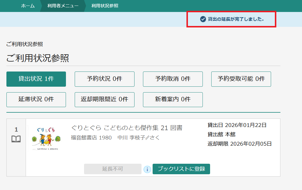 5.「ご利用状況参照」画面で、「貸出の延長が完了しました。」と出れば完了です。