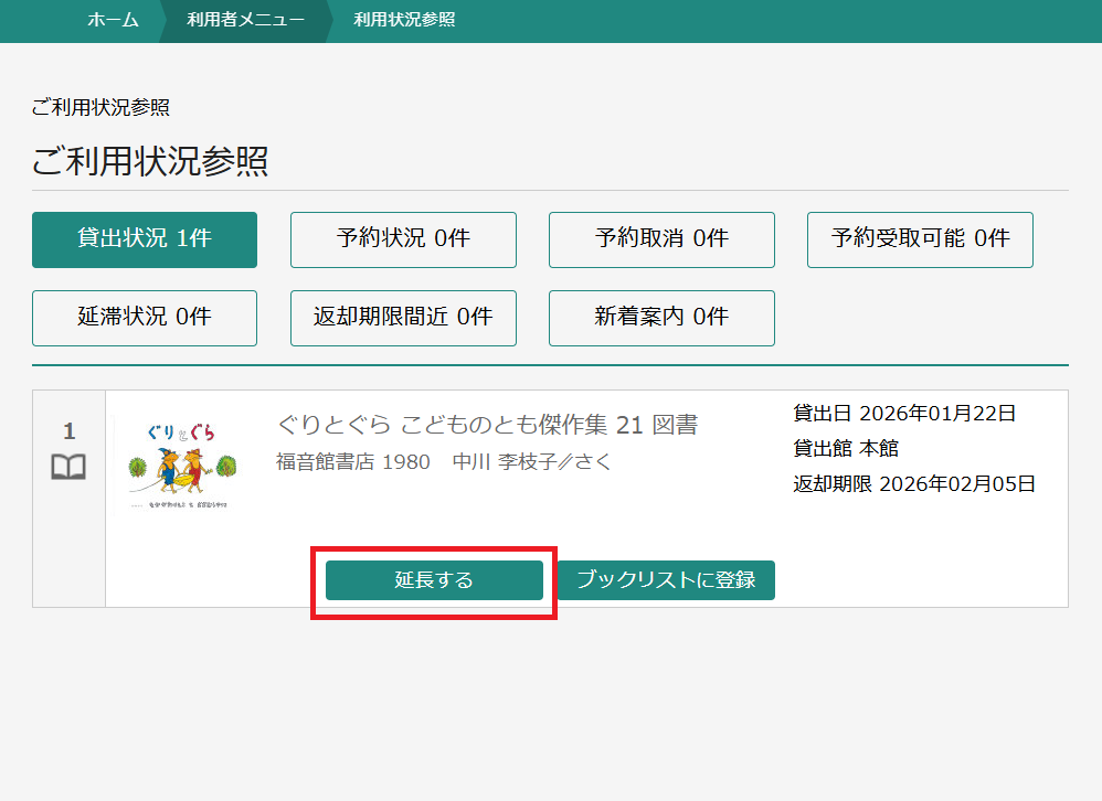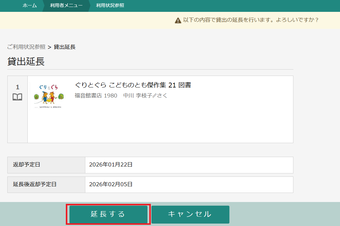 4.「貸出延長」画面で内容を確認の上、「延長する」ボタンをクリックします。
