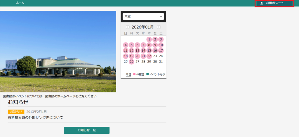 3.ログイン後のトップページの右上の「利用者メニュー」をクリックします。