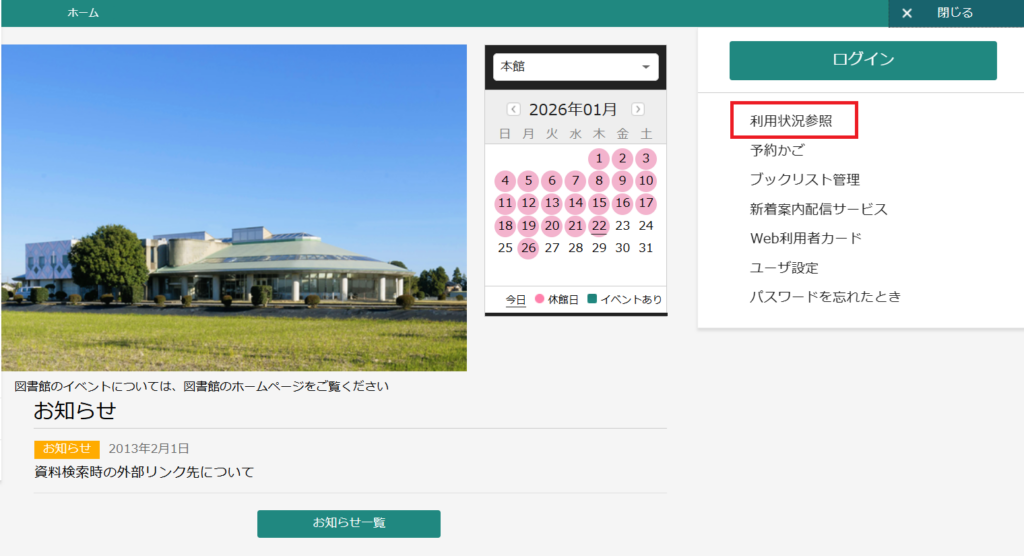 1.図書館ホームページのトップ画面にある「マイページ」をクリックします。