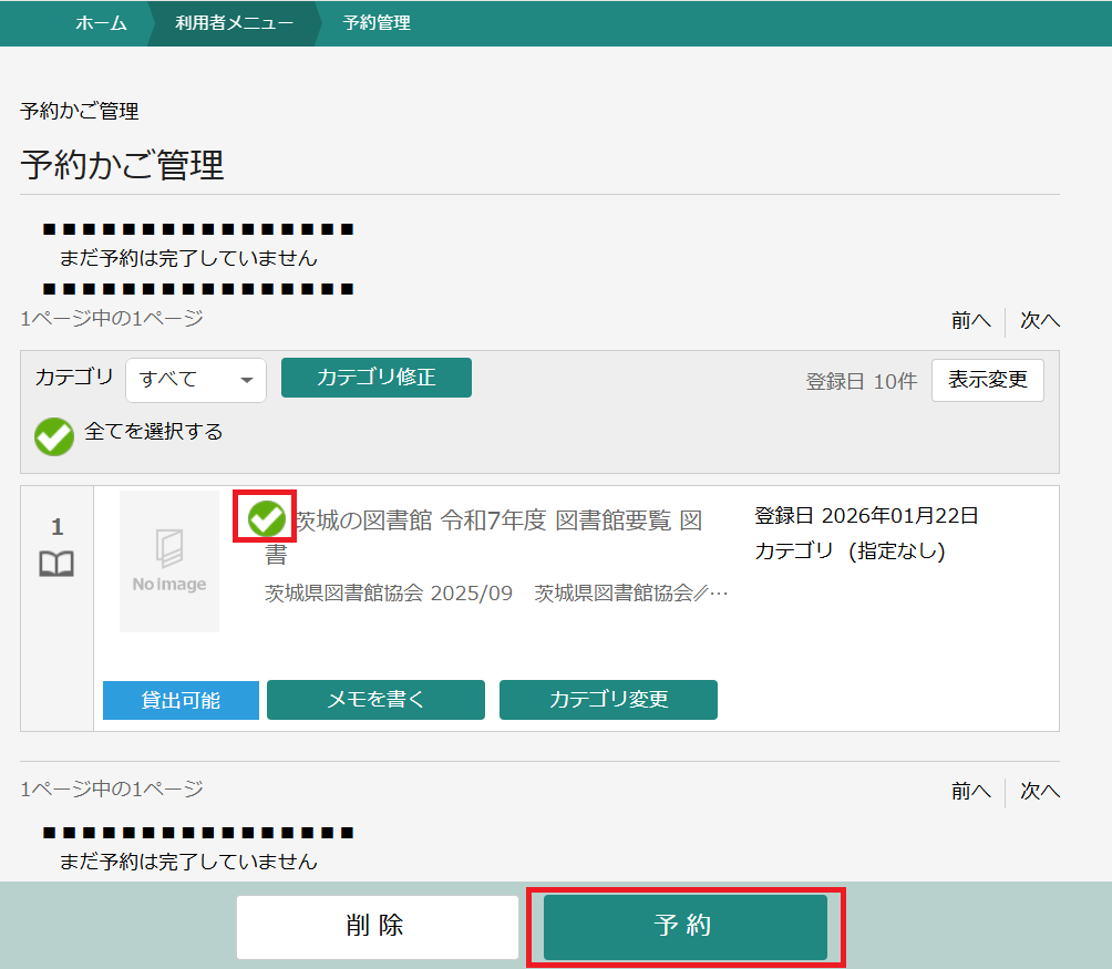 3.資料検索結果一覧の最下部の「予約かご」をクリックするか、右上の「利用者メニュー」から「予約かご」を選択し、予約したい資料にチェックを入れて、「予約」ボタンをクリックします。