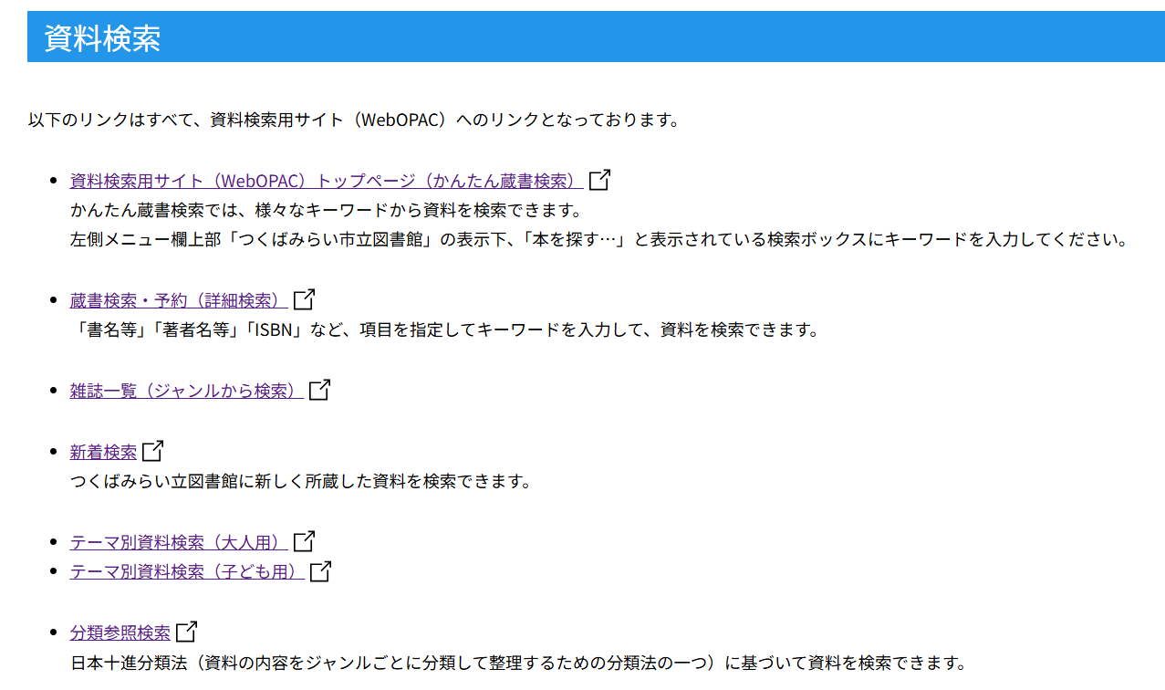 「資料検索」をクリックすると、いくつかの検索方法が表示されます。